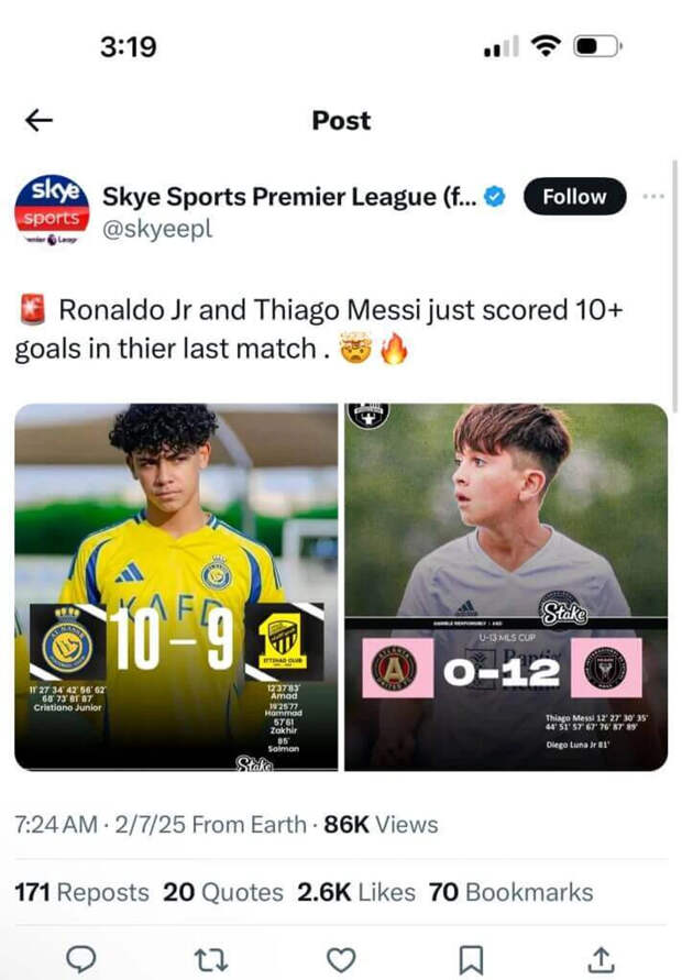Тиаго (так зовут сына Месси) и Криштианинью уже втянуты в войну фейков в социальных сетях: им приписывают сумасшедшее количество голов. Все началось с поста на странице с сомнительным названием Skye Sports Premier League в феврале этого года. Якобы Роналду-младший забил все десять голов в матче между «Аль-Насром» и «Аль-Иттихадом» (10:9), а Тиаго Месси – и вовсе 11 в игре за «Интер Майами» на Кубке MLS среди юниоров до 13 лет.