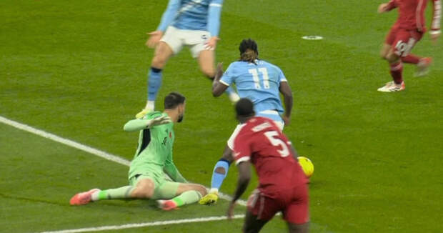 «Сити» классно поддавил в начале – и быстро заработал пенальти. Жереми Доку воспользовался ошибкой Ибраима Конате, влетел в штрафную и запнулся о колено вратаря «Ливерпуля».