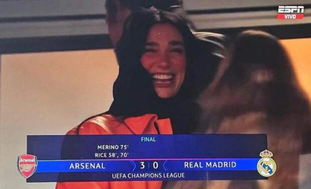 Дуа Липа давно увлекается футболом: пела на финале ЛЧ в 2018-м и даже признавалась, что болеет за «Арсенал» – как ее папа и брат, выбора и не было. В апреле даже посетила «Эмирейтс», когда лондонцы играли с «Реалом» в Лиге чемпионов.