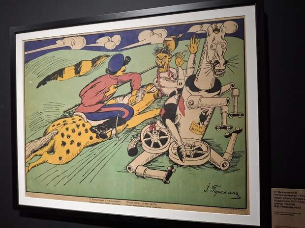 Если продолжить мотать пленку повествования назад, то предыдущей главой станет рассказ о патриотическом порыве, пережитом страной и персонально авангардистами после вступления Российской империи в мировое противоборство. Тогда они страстно рисовали «кровожадные» антигерманские плакаты с пронзенным копьем лицом Вильгельма II, а Северянин обещал в стихах «в час убийственный» повести соратников на столицу вражеской империи. Созданную по мотивам его стихотворения работу Михаила Ле-Дантю «Поход Игоря Северянина на Берлин» экспонируют также нечасто. Но главный уникум раздела о ПМВ — все же комплект фронтовых литографий Гончаровой «Мистические образы войны».