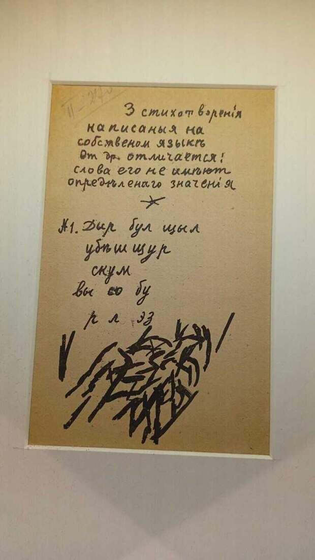 Перед нами «неприметная» пожелтевшая страничка с музейным номером в левом углу. На ней — текст знаменитого стихотворения Крученых, написанного «на собственном языке», слова которого «не имеют определенного значения»: