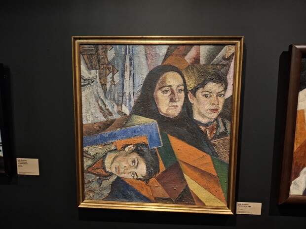 Пушкина, ГИМ, Русского музея, Музея Ахматовой в Фонтанном доме и так далее. В итоге о футуризме рассказывают сотни экспонатов, включая выдернутые ненадолго из частных собраний. Так что корреспонденту, увидевшему этот предметный массив, остается только передать, как хороши сливки, которые барин едал, а читателю — поверить на слово.Понятно, что многие писатели-футуристы были художниками, но речь зачастую идет о создании ими коллажей и не обязательно высокохудожественных, но оригинальных иллюстраций. Однако собственно живописных полотен на Зубовском представили достаточно, причем не только в воспроизведениях (физических или явленных с помощью проектора на стене либо заднике отдельного участка экспозиции). Например, в подлинниках выставили картины «Цветущие яблони», «Солнце», «Беженцы в Уфе» и «Семейный портрет» Бурлюка (две последние, созданные в годы Первой мировой войны, экспонируются впервые и являются уникальными, так как в них проступают черты реалистического искусства). Далее — портрет Маяковского работы Василия Чекрыгина (незавершенный), «Супрематический пейзаж» Зданевича, «Натюрморт. Шляпы и зонтики» Натальи Сергеевны Гончаровой. Отдельно нужно сказать о польском художнике Зыгмунте Валишевском.